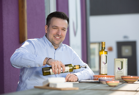 Bastian Jordan ist als Olivenbauer aufgewachsen. Er machte eine Ausbildung zum Industriekaufmann, aber die Entscheidung, ins elterliche Unternehmen einzusteigen, fiel früh. „Schon als Kind bin ich auf die Olivenbäume geklettert und konnte von hier aufs Meer schauen. Bei der Ernte und Produktion war ich von klein auf dabei.“ Heute leitet er den Betrieb in Hilden, ist aber zur Erntezeit immer auf Lesbos mit dabei, um zu helfen.